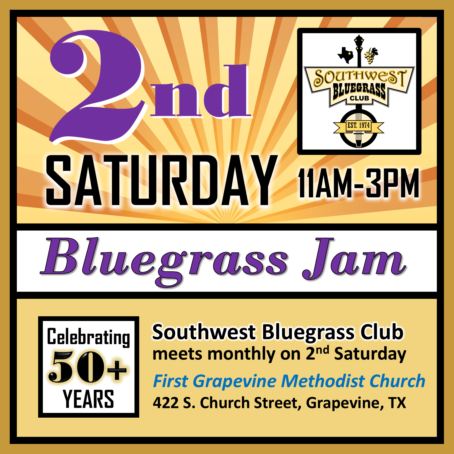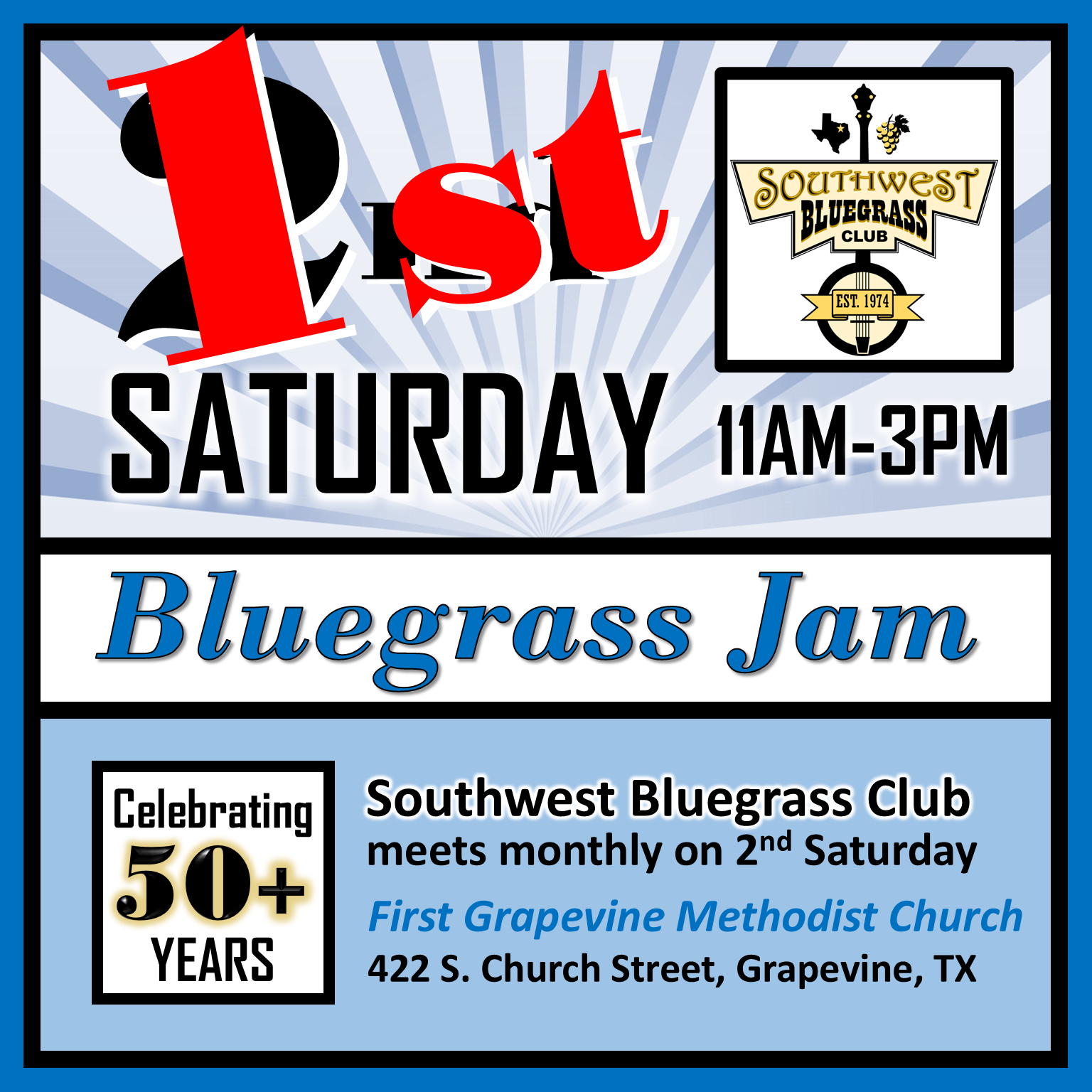 Our club jam/meetings take place on the 2nd Saturday of each month at the First Grapevine Methodist Church, Grapevine, TX. Jam/Meetings last from 11 AM-3 P.M. unless otherwise announced. We offer great opportunities for jamming with multiple jam rooms including a Youth Jam and Intro to Jamming, so be sure to bring your instrument if you play. All skill levels are welcome. If you are a casual listener who enjoys listening to great music, we would love to have you as well!