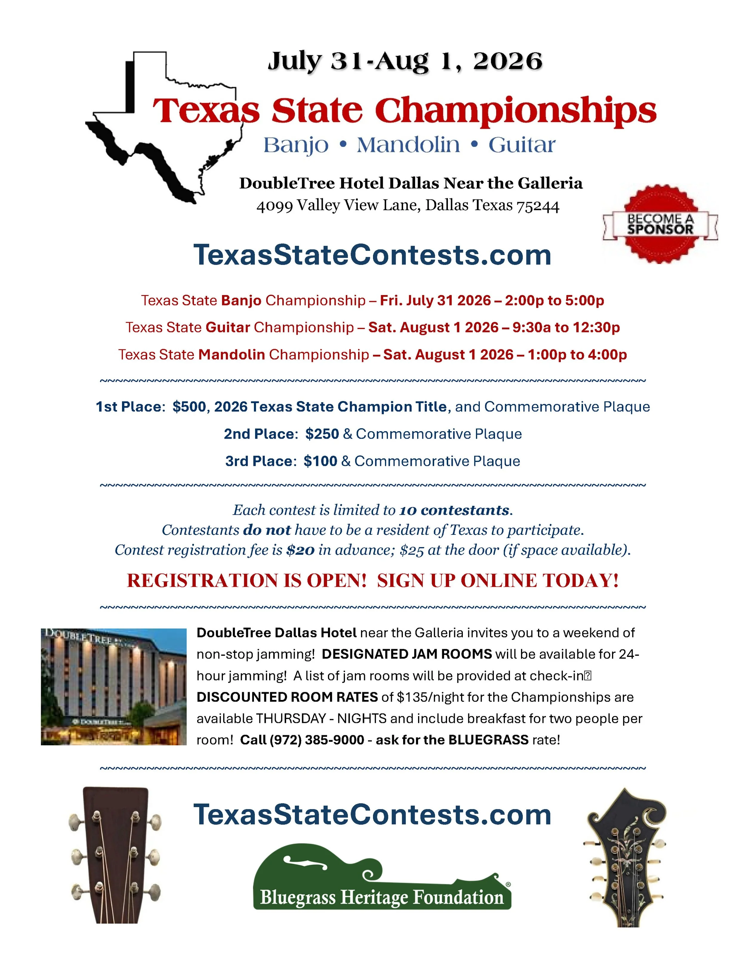Your tax-deductible donation will go directly into the Prize Money Purse for the 1st, 2nd, and 3rd place winners of the Guitar, Banjo, and Mandolin competition at the 2026 Texas State Championships. Your donation will be added to the amounts listed on the flyer below.